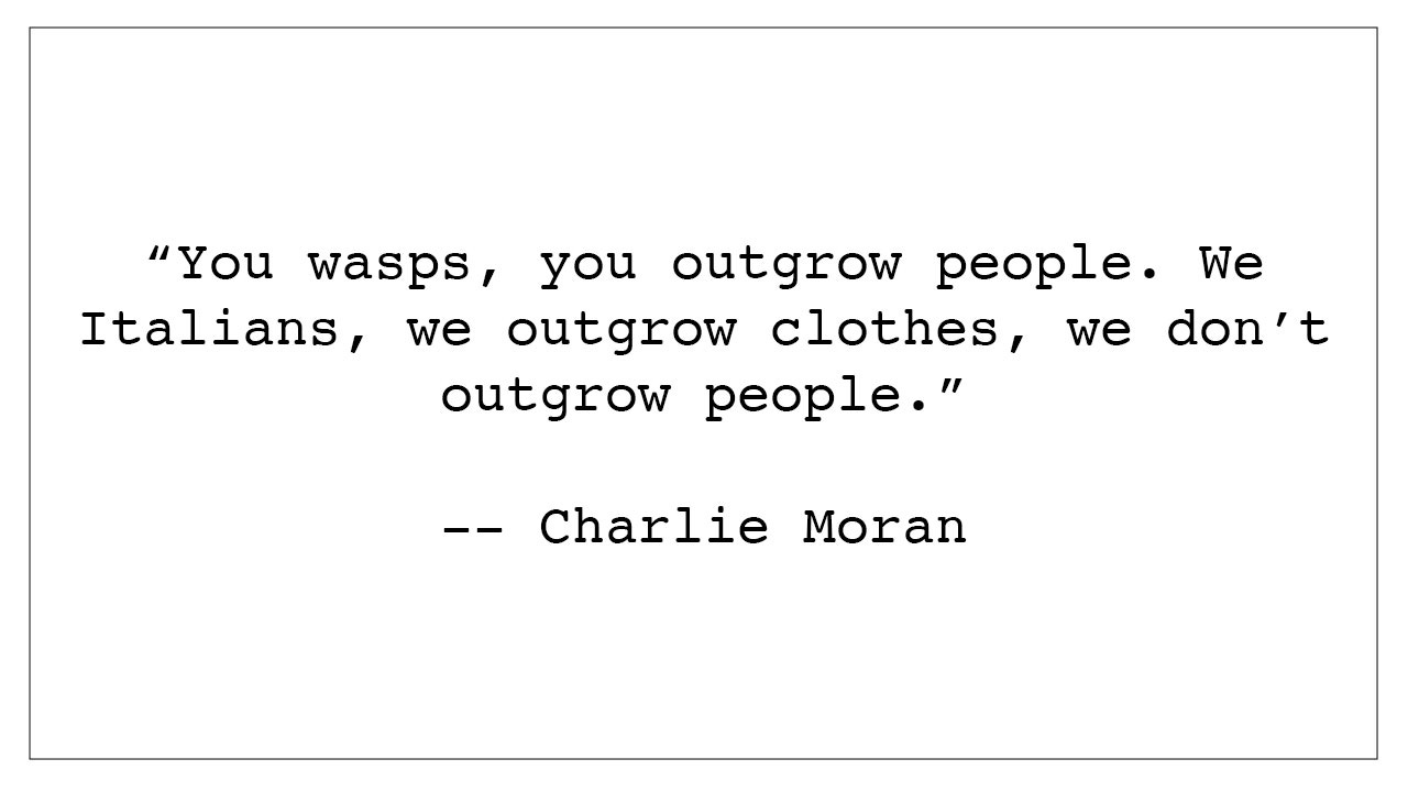 Watching their blood bond get driven to the edge inside such a wholly complete world is funny, exciting, and frightening. Throw in a waspy love interest, Diane, played by Darryl Hannah, and the powder keg is set. When she asks Charlie why she doesn’t just outgrow his bumbling cousin, he says, “You wasps, you outgrow people. We Italians, we outgrow clothes, we don’t outgrow people.”