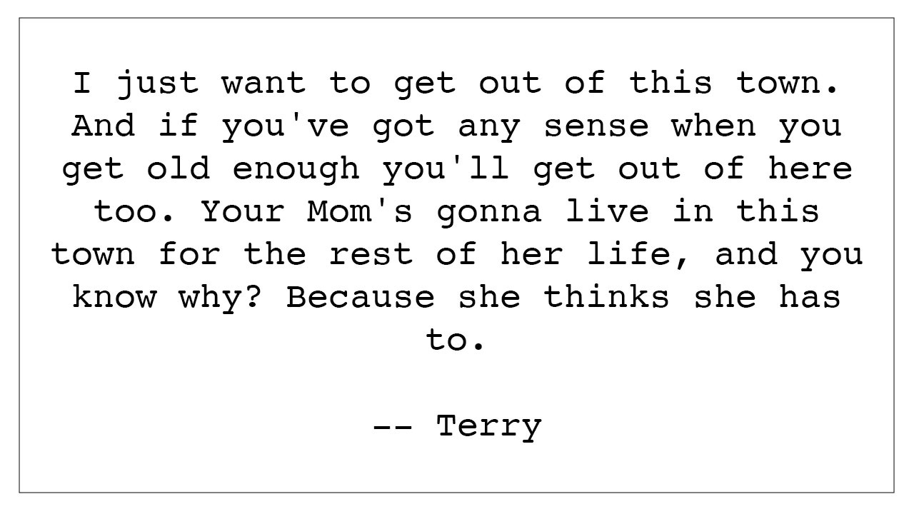 Terry is a drifter who refuses to settle down in any one place or commit to anything or anyone. He drifts in and out of town to see his sister and nephew, usually for money, and quickly bails out before family obligations sink their hooks into him.