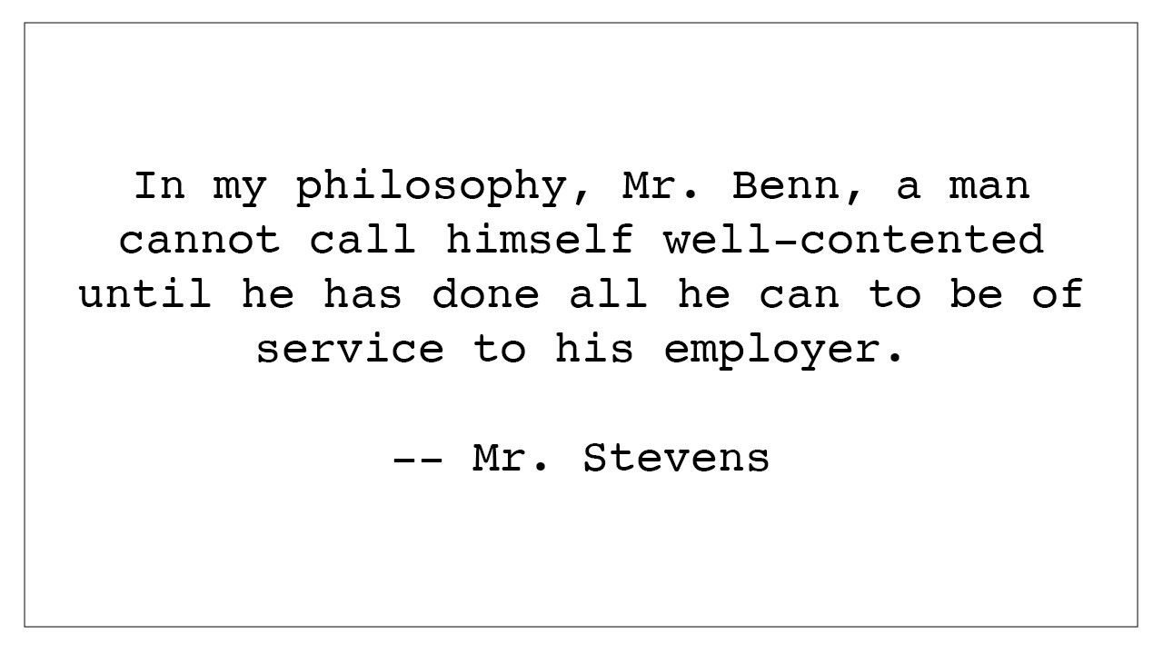 When she tells Mr. Stevens of her proposal, hoping to elicit an emotional reaction, something to give her a glimmer of hope that he feels something for her, he gives her nothing. He simply congratulates her on her engagement with a straight face and a smile.