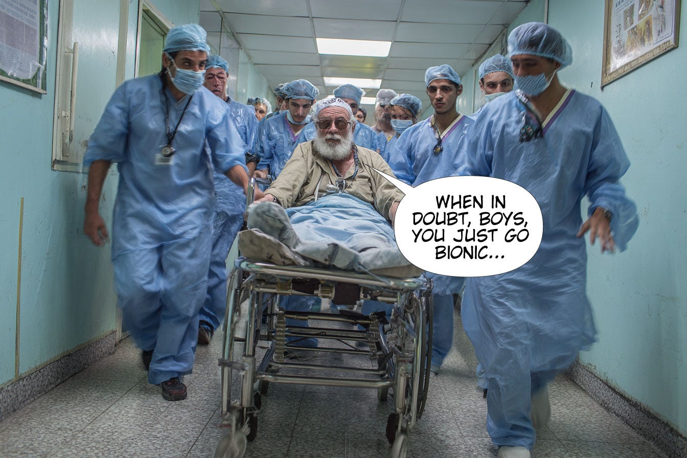 “Yes, I did, as a matter of fact. I had a penile implant,” He waited for them to acknowledge him and then added, “You know what I always say? When in doubt, you just go bionic.”