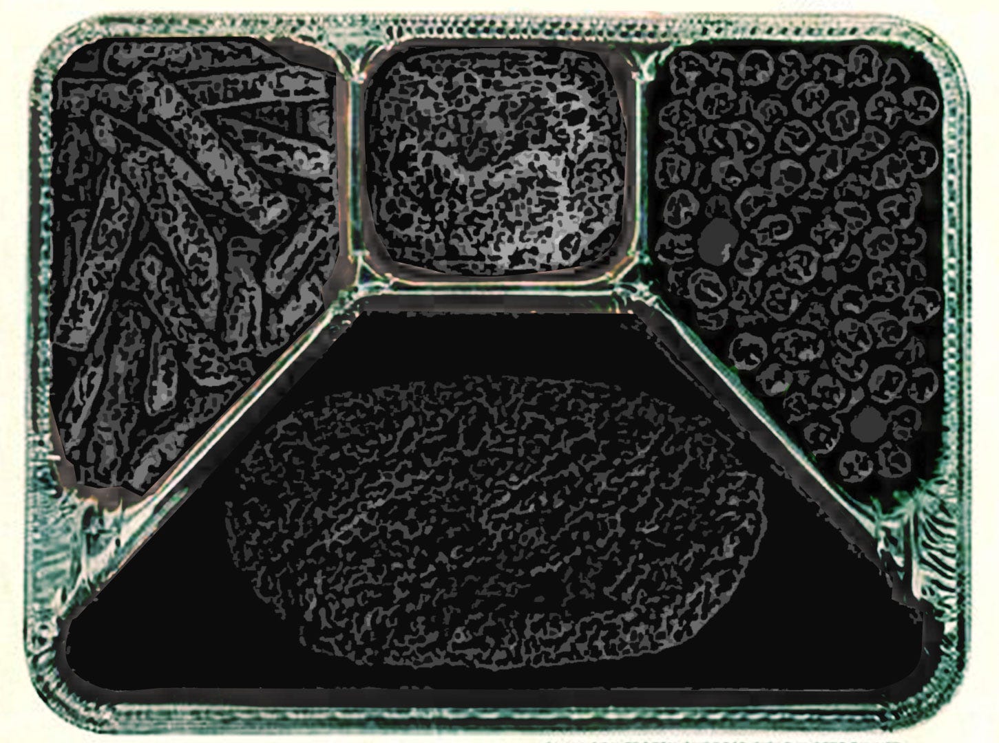 There on the counter, left in plain sight for all to see, was the offending item. The blackened, scorched remains of a Salisbury steak Hungry Man dinner, the aluminum tray intact, its items all in their designated sections. A charred hunk of black processed meat acted as the centerpiece, flanked by mashed potatoes rendered indistinguishable from the apple cobbler. The side of peas was reduced to little more than a pile of little black stones.